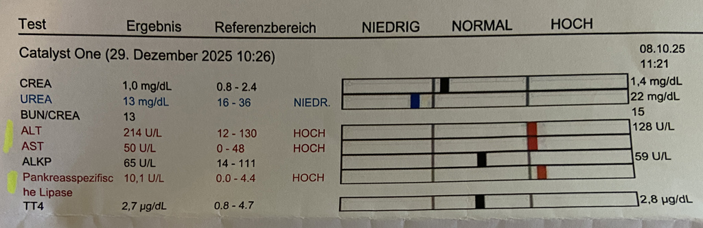 Am nächsten Morgen war Balu wieder schlechter drauf. Zwar nicht ganz so schlecht, wie am Sonntagmorgen. Aber er hatte erneut merklich abgebaut. Also ihn eingepackt und pünktlich zur Praxisöffnung vor der Tür gestanden. Ein Blick auf die Waage offenbarte, dass er weiter abgenommen hatte. Anfang Dezember lag er noch bei 5,5kg – jetzt waren es nur noch 4,9kg. Gar nicht gut. Die Tierärztin kam relativ zügig zum Thema Bauchspeicheldrüse (Pankreas) und Leber sowie möglicherweise Schilddrüse. Also Blut abgenommen und auf das Ergebnis gewartet – und sie sollte Recht behalten. Er hatte eine Bauchspeicheldrüsenentzündung und auch die Leberwerte waren nicht gut. Wobei es hier tatsächlich einen erklärbaren Zusammenhang gibt: