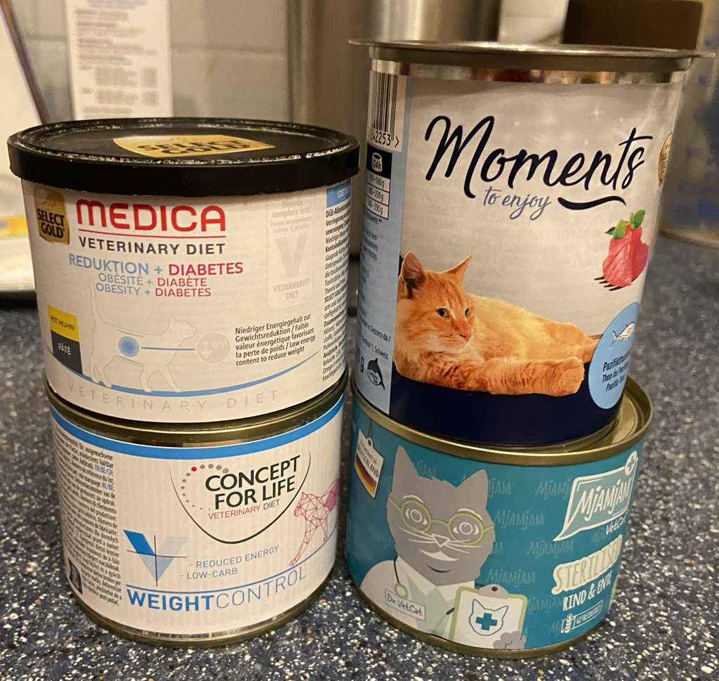 Gar nicht so einfach da anständiges Alleinfutter zu finden – von preiswert brauchen wir gar nicht zu reden. Wir sind deshalb tatsächlich mal in den örtlichen Fressnapf*. Dort sind wir auf die Diät-/Diabetesfutter von MjAMjAM* (Fettgehalt 3,8%) und SELECT GOLD* (2% Rohfett) gestoßen. Außerdem das sündhaft teure MOMENTS* (Fettgehalt 2,7%). Alles leider nur in kleinen Döschen und zu Preisen, wo einem die Ohren schlackern. Das MOMENTS schießt mit fast 14€ pro Kilo den Vogel ab. Wir liegen sonst so mit unserem hochwertigem Katzenfutter (dank Rabattaktionen) eher bei 4-5€ pro Kilo. Dreimal dürft ihr übrigens raten, welches von den Dreien ihm am besten schmeckt. Selbstverständlich das teuerste