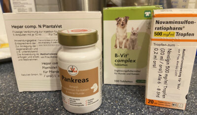 Ob Balu eine Triaditis hat oder es doch etwas mit der Schilddrüse ist (weil er so viel abgenommen hat), wissen wir zum aktuellen Zeitpunkt allerdings noch nicht. Stattdessen heißt es jetzt erstmal die Bauchspeicheldrüse in den Griff bekommen und die Leberwerte zu stabilisieren. Dazu bekam er direkt in der Praxis vier Spritzen verabreicht: Kortison gegen die Entzündung, Novalgin gegen die Schmerzen (der Wirkstoff in Onsior würde das Problem eher verstärken), einen wohl unangenehm brennenden Vitamin-B-Cocktail zur Unterstützung der Leber und ein weiterer Mix für den Pankreas.
