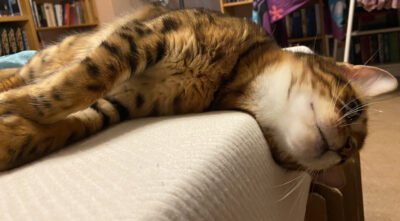 Der Schrank hat sich ebenfalls ziemlich erledigt. Wenn ich oben rumstapfe, wird mitunter noch kurz drüber nachgedacht reinzuschlüpfen, um mir auszuweichen. Aber die Tage oder gar die Nacht darin verbringen? Das ist jetzt schon länger vorbei. Stattdessen haben sie nun das restliche Haus “erobert”. Erst haben sie sehr zaghaft und “heimlich” die Räume erkundet, in denen wir gerade nicht waren. Mittlerweile schläft Ayla sogar mit im Arbeitszimmer in einem Wandbett während Miro gerne auf einer Welle auf dem Fensterbrett im Wohnzimmer chillt.