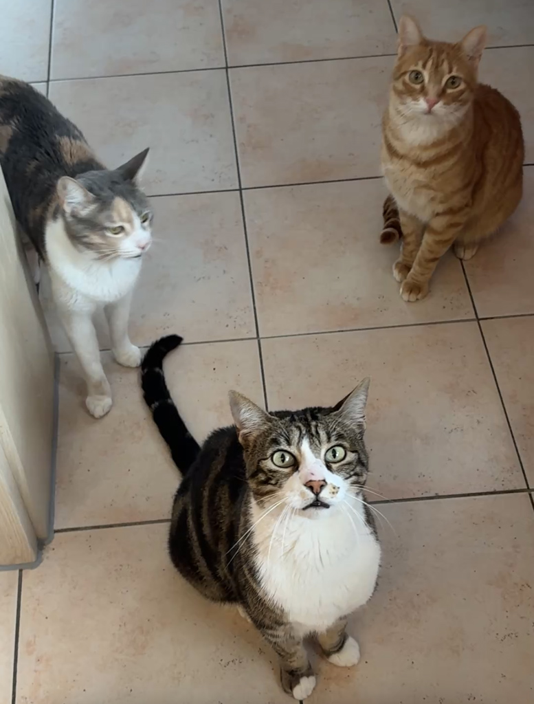 Das Reden haben Ayla und Miro mittlerweile auch schon angefangen. Sehr hohe Stimmchen die beiden. Sie wissen zwar vermutlich noch nicht so recht, warum sie reden. Aber in unserem Haus scheint man das halt so zu machen. Morgens z.B. haben wir ja die Action in der Küche, um den Aperitif (ggf. mit Medikamenten versetzt) zu verteilen. Da wird fleißig gemaunzt und gejammert. Ayla und Miro verstehen zwar nicht, was an diesen Schälchen mit normalem Futter so besonders sein soll, aber erstmal mitmaunzen kann man freilich trotzdem.