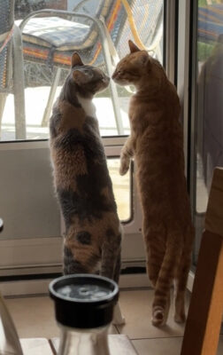 Fassen wir also zusammen: Fünf Wochen sind Ayla und Miro mittlerweile bei uns und sie entwickeln sich prächtig. Uns gegenüber sind sie weiterhin (wie erwartet) zurückhaltend. Da wird sich noch geduckt, weggesprungen und ein näherkommender Finger sehr argwöhnisch beäugt. Anfassen ist also absolut noch kein Thema. Wobei Miro immerhin schon zaghaft Leckerli aus der Hand nimmt. Wir sind also schon viel weiter als am Anfang.