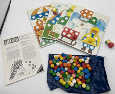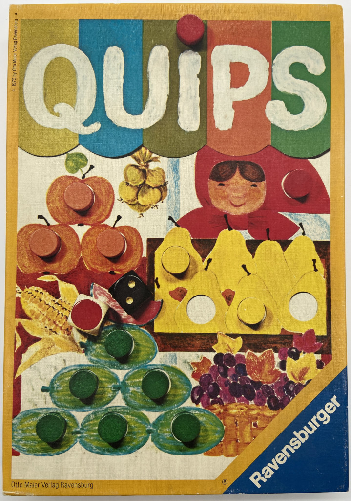 Wenn wir schon beim Thema Brettspiele sind: Ich erwähne ja hin und wieder, dass die Erinnerungen an meine Kindheit und Jugend aus diversen Gründen nur sehr undeutlich, bis gar nicht vorhanden sind. Aber vereinzelte Sachen sind mir dann doch vergleichsweise gut im Gedächtnis geblieben. Darunter das Brettspiel Quips* von Ravensburger – allerdings nicht in dieser neumodischen Packung mit den komischen Bildern, die ihr aktuell kaufen könnt. Stattdessen die Originalausgabe von 1972 mit der Frau am Marktstand auf dem Cover (siehe Bild).