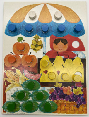 In der Packung enthalten sind (damals wie heute) vier Spielbretter (=bis zu vier Spieler) mit verschiedenen Motiven. In der Originalversion ein Kind mit Puppe und Schaf vor einem Baum, die Dame am Obststand vom Cover (mein absolutes Lieblingsspielbrett), zwei Indianerkinder mit einem Tipi (politische Korrektheit war damals noch nicht so “in”) und ein ziemlich eingepackter Junge in einer Winterlandschaft mit Schlitten und Schneemann. In die Spielbretter sind Löcher gestanzt (=fallen die Steine nicht gleich runter!). Ziel ist es diese mit gleichfarbigen Spielsteinen zu füllen. Gewonnen hat in allen Spielvarianten entsprechend derjenige, der das als erstes für sein Spielbrett schafft. Spielsteine gab es damals 84 Stück in 6 Farben für alle Spielbretter zusammen, heute sind 90 Stück in der Packung. Der Schwierigkeitsgrad wurde also etwas angezogen.