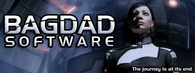 Den Hintergrundbild ein Ausschnitt aus einem Screenshot, den ich damals zum Test von Mass Effect 2 angefertigt hatte und zeigt meine Sicarii Shepard vor dem Reaktor der Normandy. Der Text wurde mit der Schriftart "Slider" verfasst, die von einem Fan der Serie erstellt wurde und dem Original exakt gleicht. Das "Bagdadsoftware" wurde dann noch mit einer Verlaufsüberlagung von Weiß ins Blau aus dem Originallogo und einer schwarzen Kontur mit 3px Breite verstehen. Den Abschluss bildet ein schwunghafter Einsatz des Radiergummis durch den Schriftzug hindurch.
