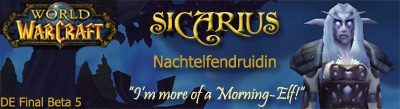 Mit reichlich Verspätung (musste ja das Game vorher ausgiebig spielen ;) ) hatte ich passend zum finalen, europäischen Betatest von "World Of WarCraft" (an dem ich unerwartet teilnehmen durfte) eine Signatur mit den passenden Infos erstellt. Deshalb ist das auch dieses Mal keine wirklich Meisterleistung sondern einfach nur zweckmäßig. Die fesche Nachtelfe war übrigens Level 30 zum Entstehungszeitpunkt des Bildes (31.01.2005).
